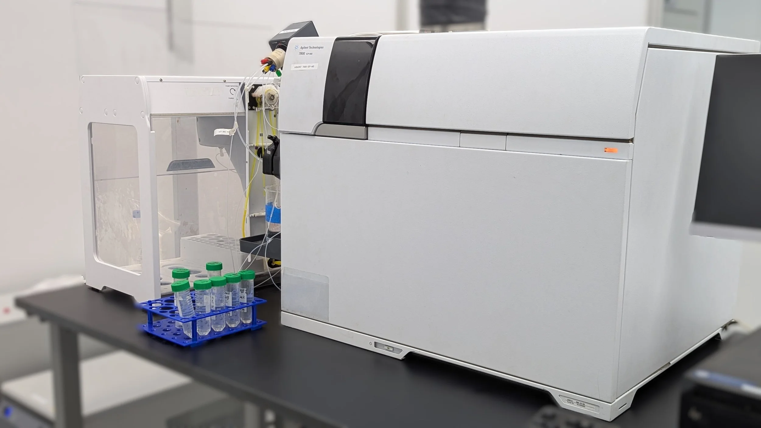 The Agilent 7800 Inductively Coupled Plasma Mass Spectrometer is an analysis instrument used to measure trace and ultra-trace concentrations of elements in various samples. It operates by introducing a liquid sample into a high-temperature argon plasma, which effectively atomizes and ionizes the elements present. These ions are then extracted from the plasma and directed into a mass spectrometer. The mass spectrometer separates the ions based on their mass-to-charge ratio (m/z) and detects them, allowing for the qualitative identification and quantitative measurement of each element.